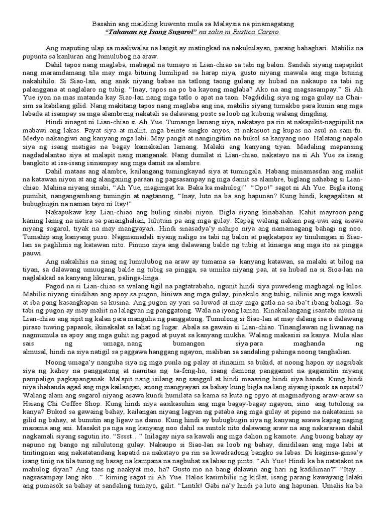 Tahanan ng Isang Sugarol Maikling Kwento Malaysia Salin ni Rustica Carpio ANG MAPUTING ULAP sa maaliwalas na langit ay matingkad na nakukulayan parang bahaghari.