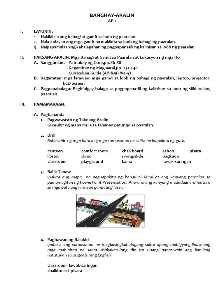 O Magtakda ng alarma para sa bawat Biyernes ng umaga 7 AM. Tagalog - Unit 3 BALS - BLLM. Gamit nito sa pagtukoy ng lokasyon Week 1 Nakagagawa ng payak na mapa ng loob at labas ng tahanan Week 2 AP1KAP- IVb-4 Natutukoy ang mga bagay at istruktura na makikita sa nadadaanan mula sa tahanan patungo sa paaralan Week 3 AP1KAP- IVc-5 Naiuugnay ang konsepto.
