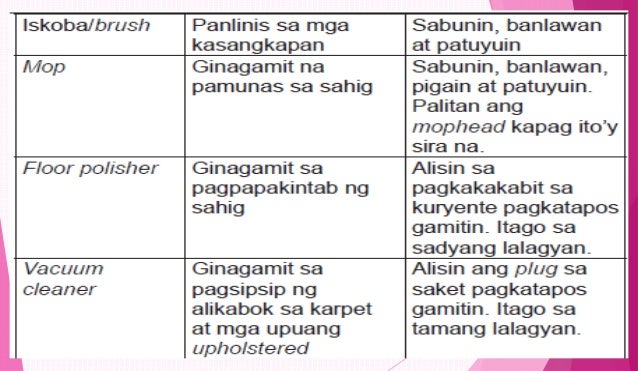Mga kagamitan sa paglilinis ng tahanan ppt. Isinasabit sa pako upang hindi agad mapudpod. Some of the worksheets for this concept are Edukasyong pantahanan at pangkabuhayan epp and Edukasyong pantahanan at pangkabuhayan Filipino sa. Magiging magaan at kasiya-siya ang paglilinis ng tahanan kapag gumagamit ng nararapat na kagamitan.